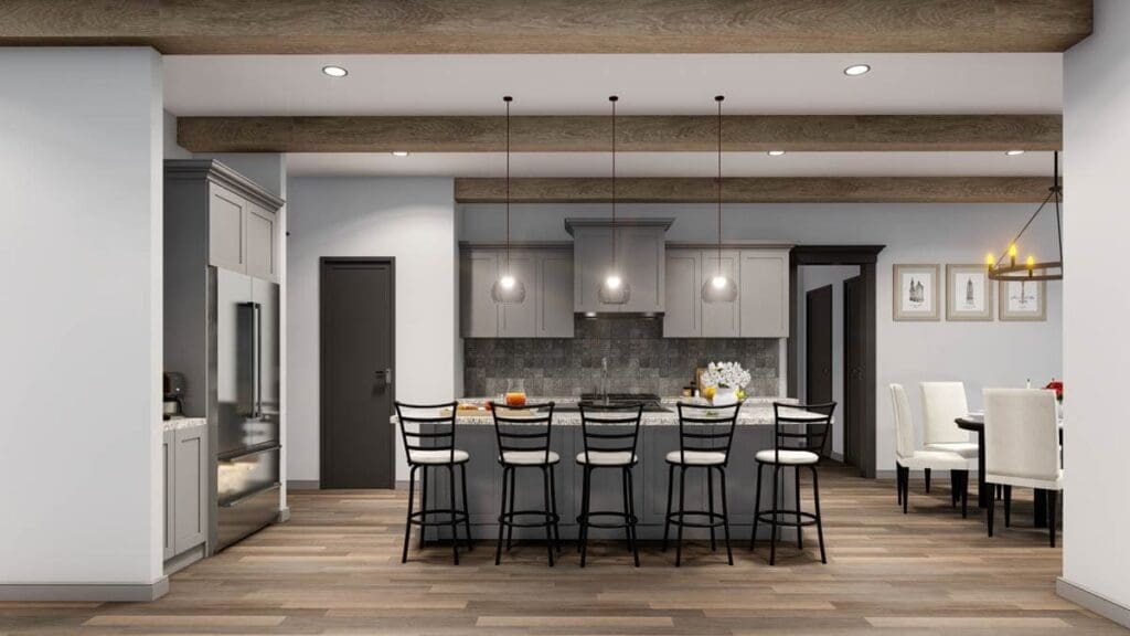 The butler pantry between the kitchen and dining room enhances functionality, providing storage and prep space that complements the layout’s flow.