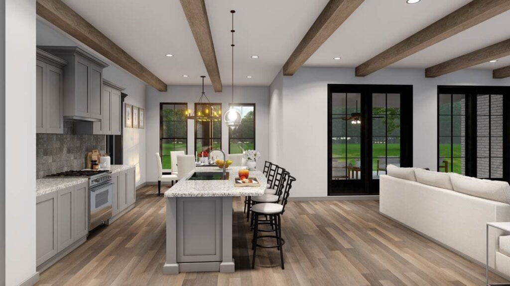 The kitchen’s placement in the floor plan allows direct access to the formal dining room and butler pantry without interfering with circulation.