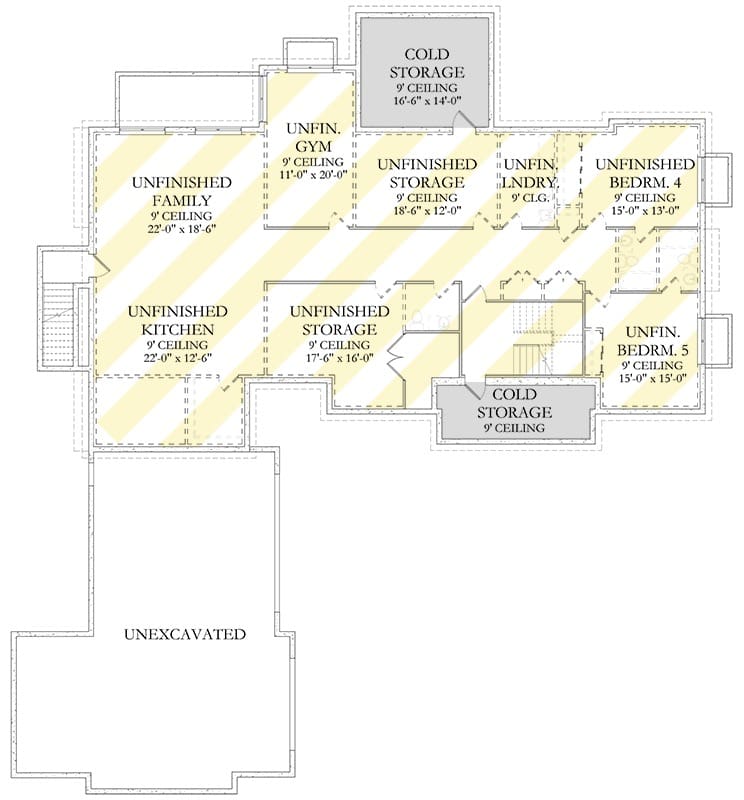 The floor plan includes a full unfinished basement, accessed from a dedicated stairway near the main living area.