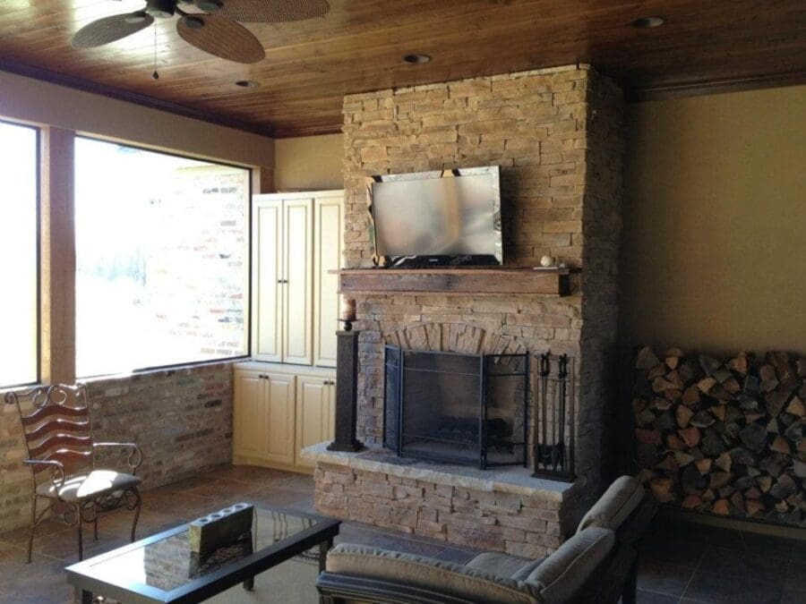 Whoever decided to include both a covered rear porch and a screened porch with a fireplace deserves an award.