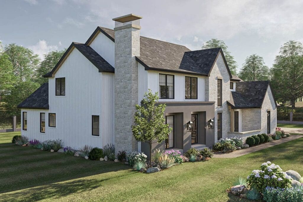 Picture this: board-and-batten siding giving off that timeless farmhouse vibe, accented with sleek stucco and grounded by rustic stone details.