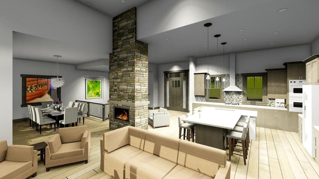 The living room, kitchen, and dining area flow together in a design that makes entertaining feel effortless.