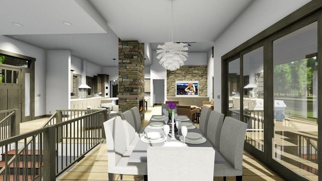 Add a rustic farmhouse table, a modern glass one, or something entirely custom—the openness adapts to your style.