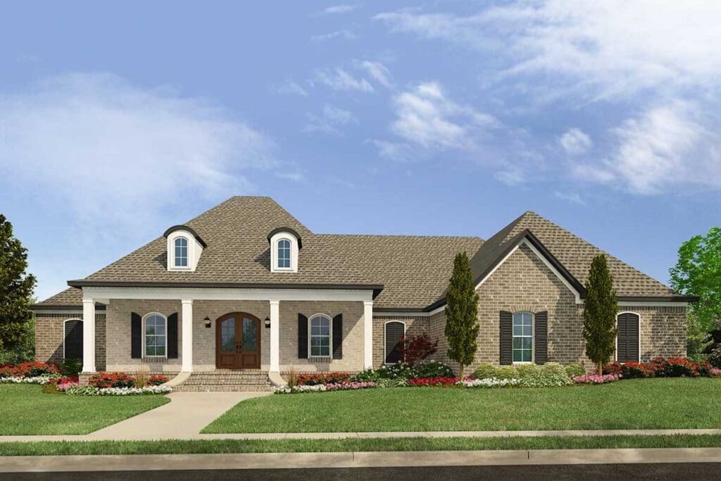 This 3,035-square-foot French Country floor plan is more than just pretty shutters and symmetrical lines.