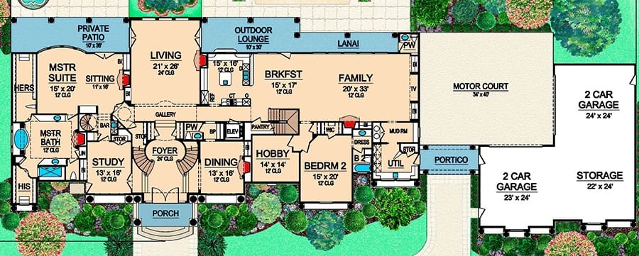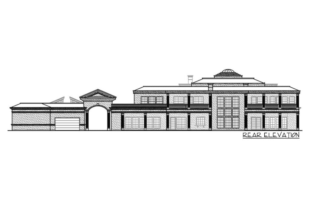 Okay, let’s just admit it—this house plan is kind of showing off. I mean, it has a motor court, a double staircase, a prep island and a barbecue porch?