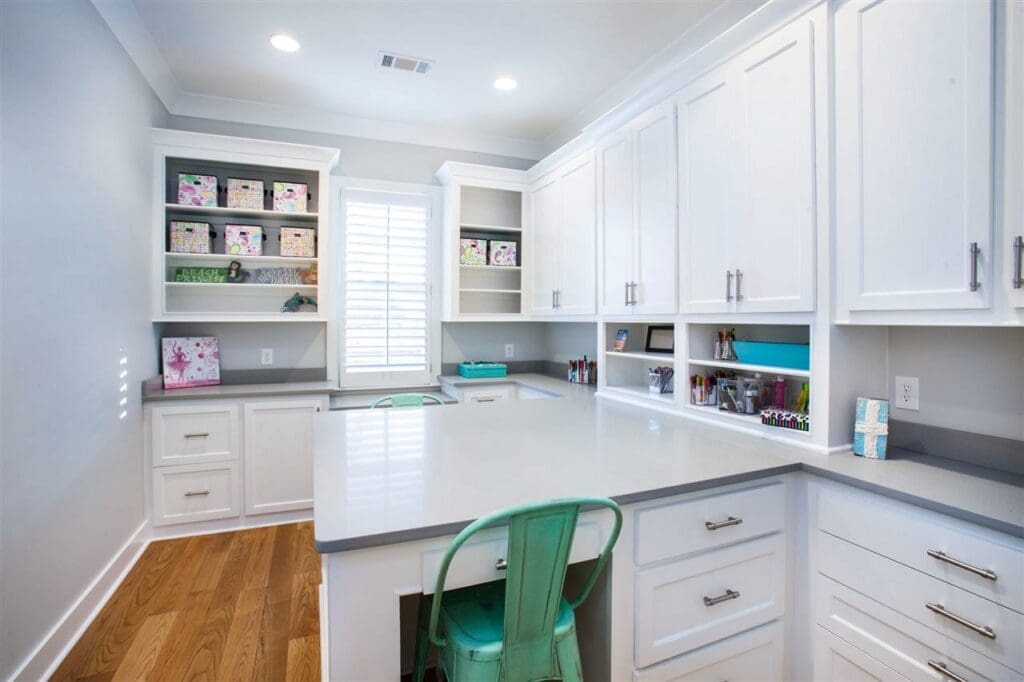 A dream-worthy craft room lined with built-ins.