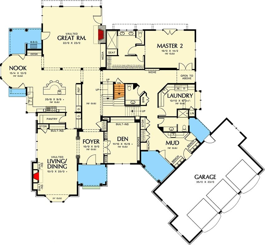 This plan features not one, but two luxurious master suites—one on the main floor and another upstairs.