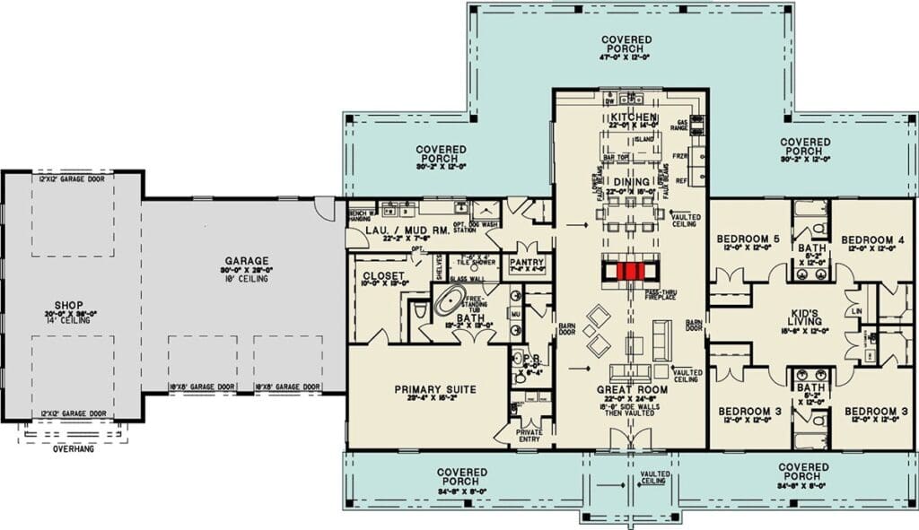One of the most unique features of this house plan is the garage setup. In addition to a standard two-car garage, there’s an oversized drive-through RV garage with 12′ x 12′ overhead doors and a 14-foot ceiling.