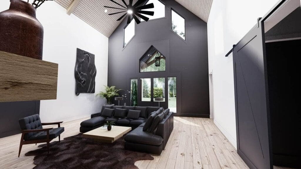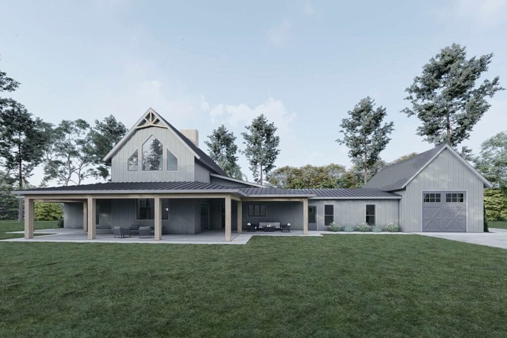 The exterior alone is worth a double take. Picture a barndominium-inspired façade paired with sleek modern details.