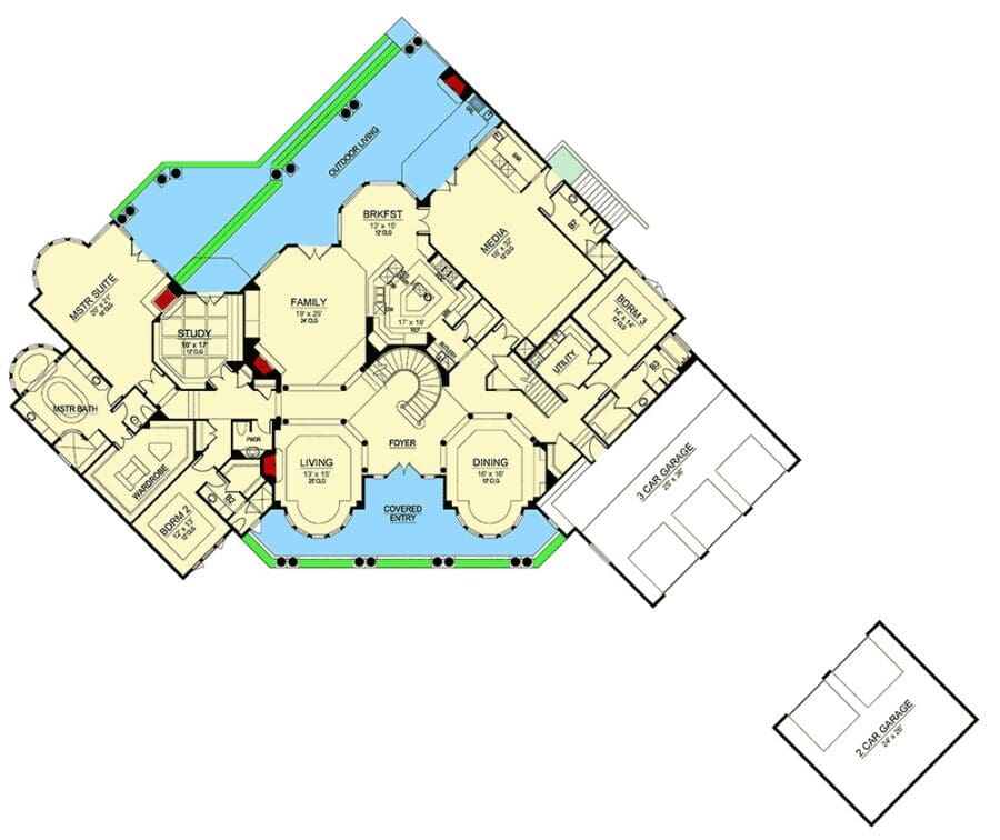 Let’s not overlook the garage. This isn’t your average two-car situation. Nope—this is a five-car attached garage with a courtyard-style entry.