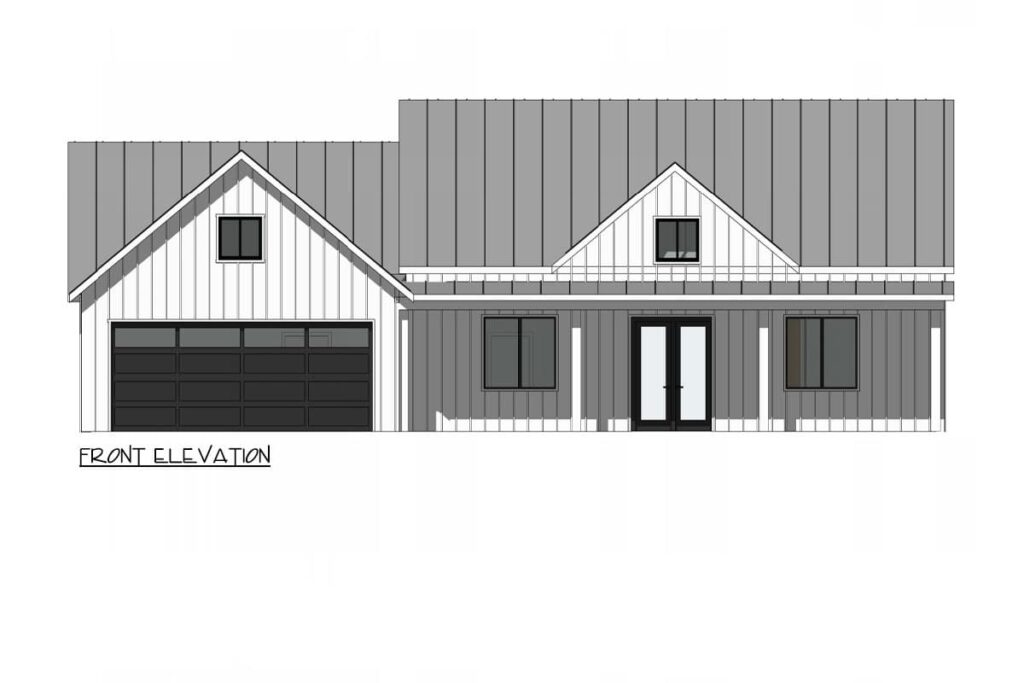 This 3-Bed Modern Farmhouse plan demonstrates a careful balance of open and private spaces.