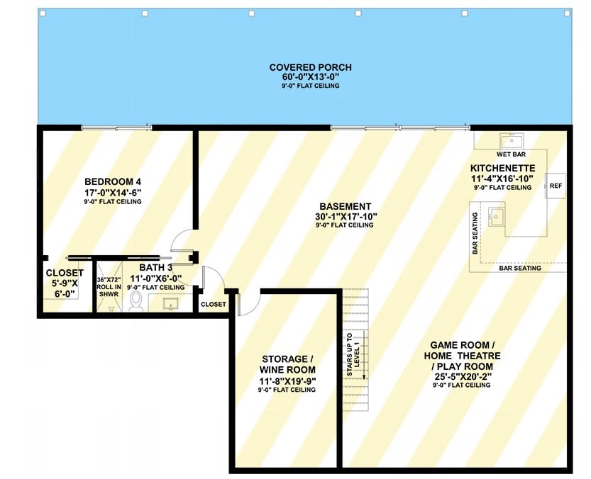 The optional lower level offers 9’ ceilings, providing generous vertical space.