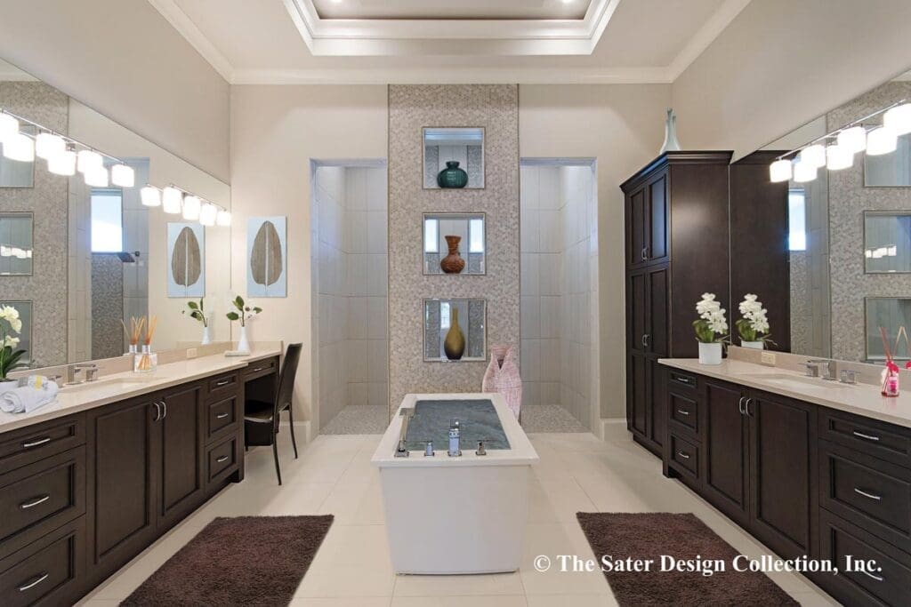 A freestanding soaking tub gazes out toward the master garden, giving you that spa experience without ever needing to leave home.