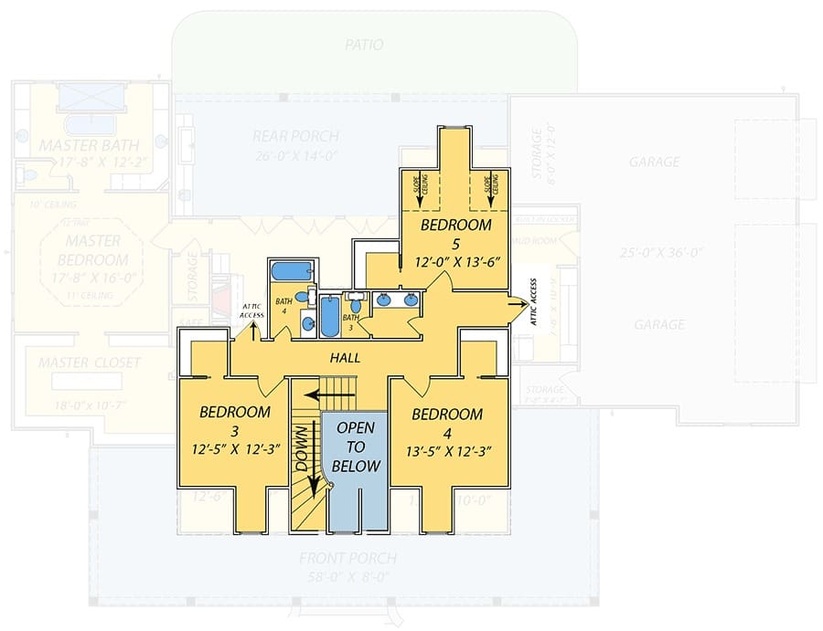 Let’s not gloss over the outdoor spaces. From the gracious wrap-around porch that’s practically begging for rocking chairs, to the big covered rear porch with a dedicated grilling station, this plan is designed to help you embrace the great outdoors. It’s Southern charm meets suburban sensibility.